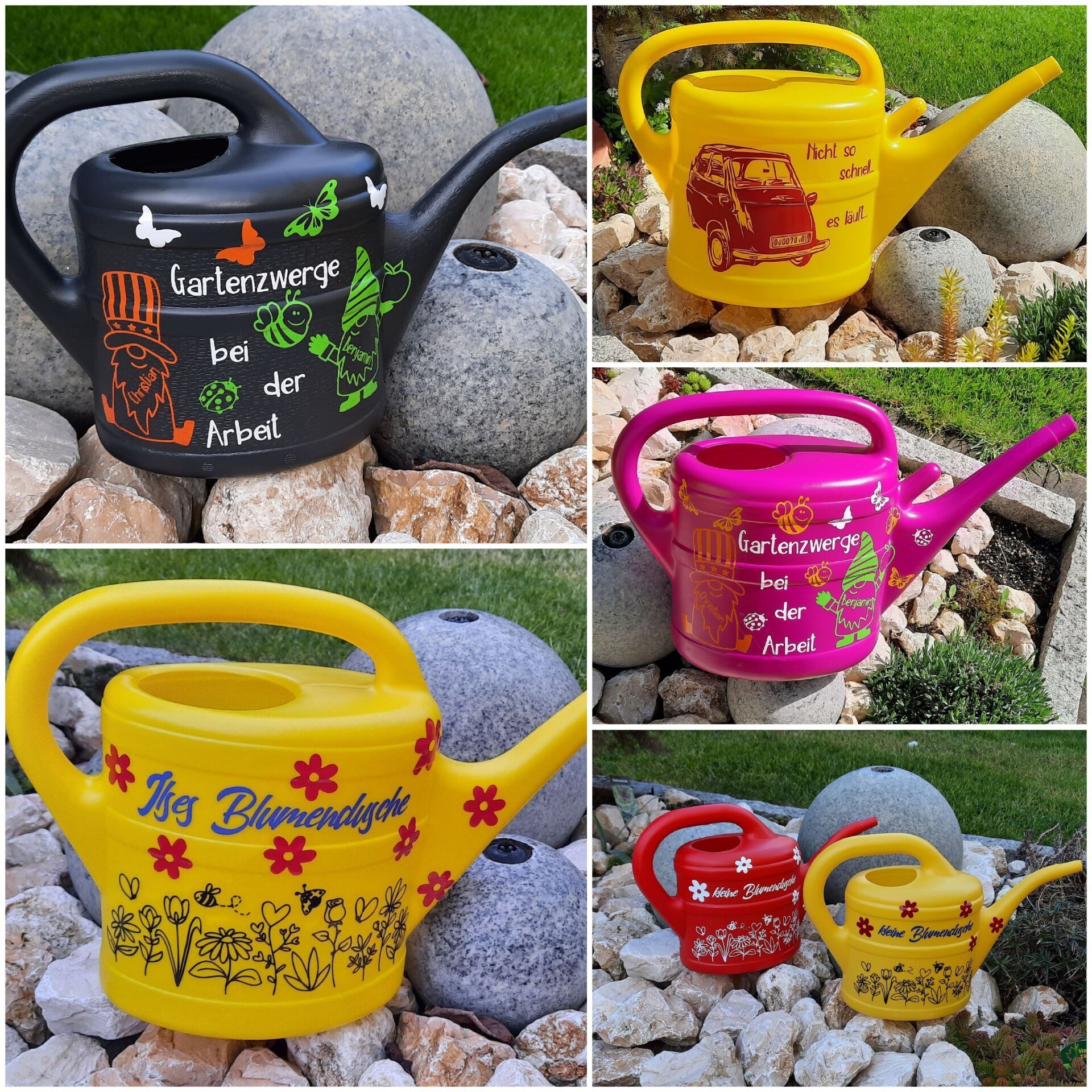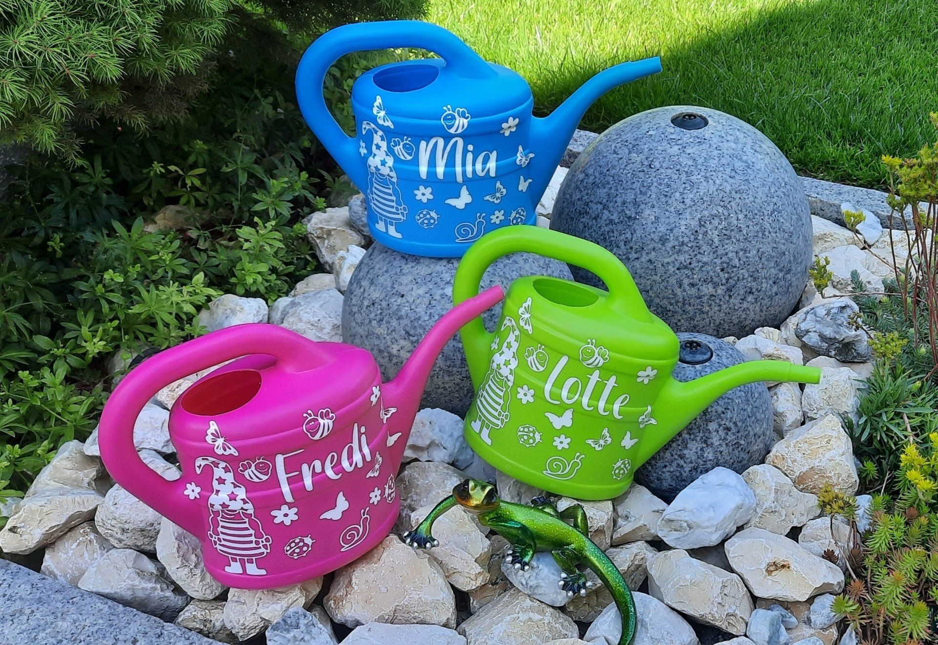 Individuell gestaltete Gießkannen in verschiedenen Größen.